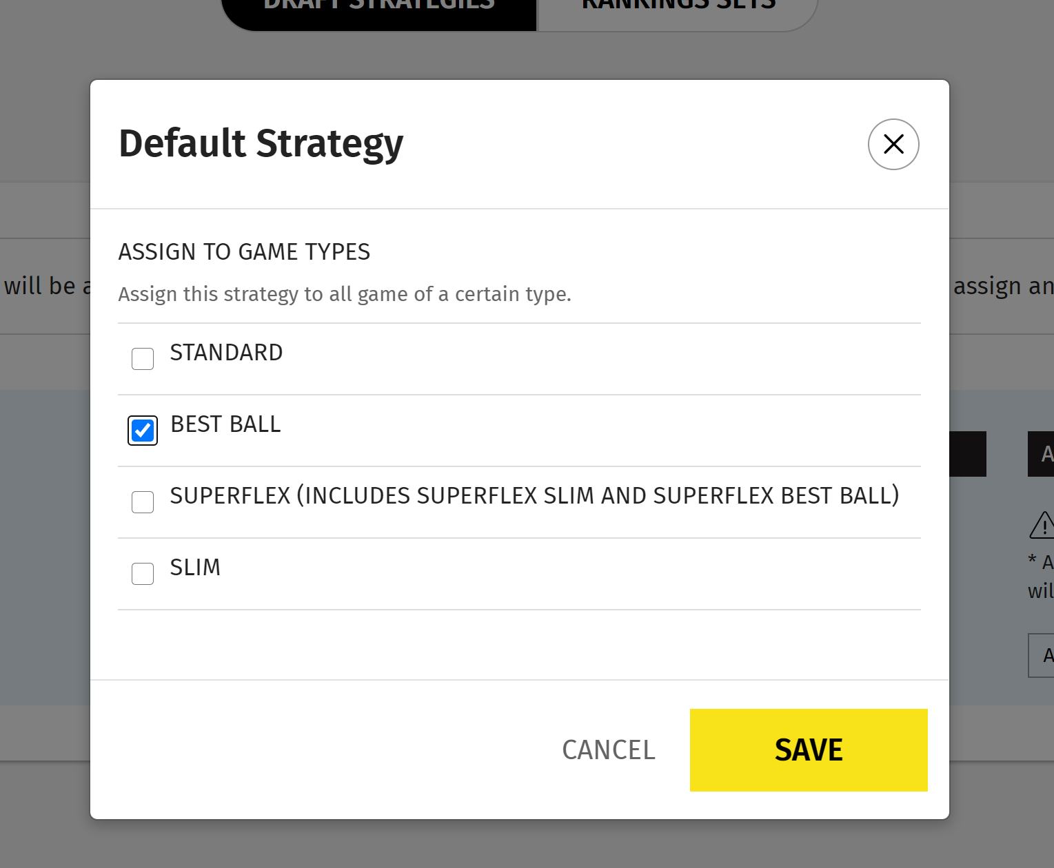 You can create as many Draft Strategies and Rankings Sets as you'd like. You can then use different strategies & rankings for different types of leagues. Maybe you want one strategy for Best Ball leagues, another for Superflex leagues and a 3rd draft strategy for everything else - it's up to you.